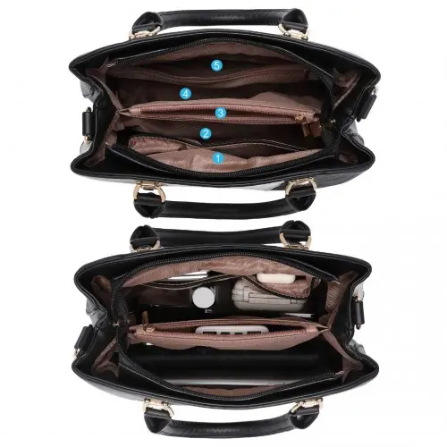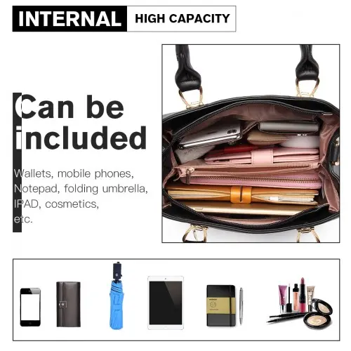 This handbag is designed for convenience, featuring robust dual carry handles and an adjustable shoulder strap for various carrying styles.