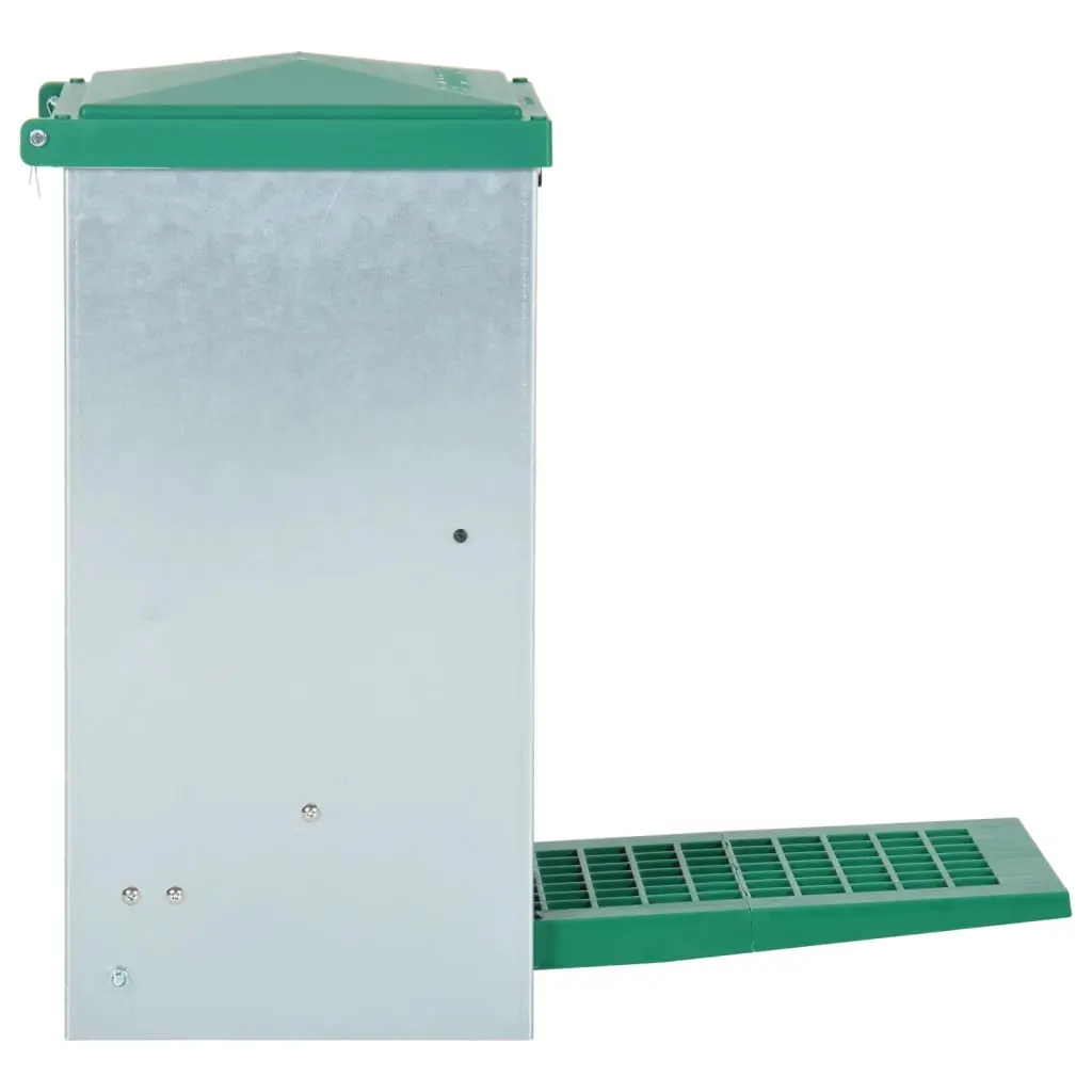 With this automatic chicken feeder, you will not have any more mice, rats and birds bordering you and eating your poultry food This feedomatic is made of zinc plated sheet with a thickness of 1 mm. which is thicker than any other feeder and therefore very stable. The treadle is made of plastic and a grid of mesh. This means that you will not be bothered by manure and water on the grid. When the animals (poultry) steps onto the treadle, the feed dispenser opens the flap for accessing the feed. Thanks to the great feed storage capacity, you will save time as you will not have to refill constantly the feeder as before.